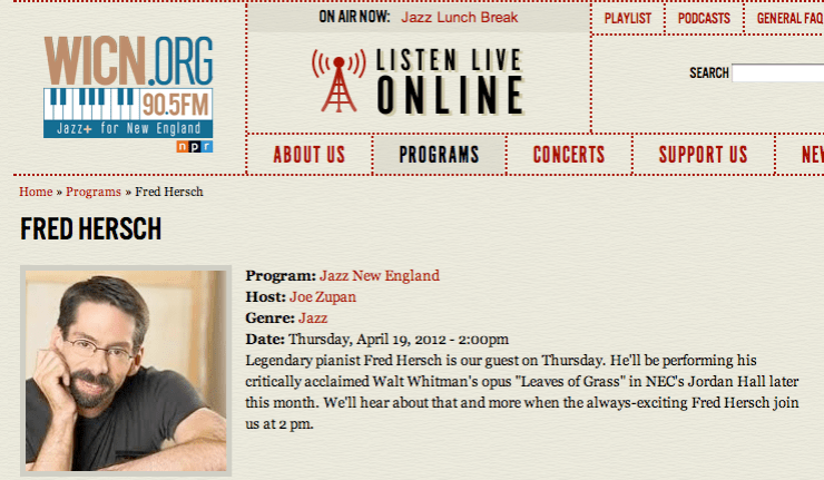 Posted on April 16, 2012May 4, 2012 by CharlotteFred will be interviewed on WICN this Thursday. Tune in! Share this: Click to email a link to a friend (Opens in new window) Email Click to share on X (Opens in new window) X Click to share on Facebook (Opens in new window) Facebook Like Loading...