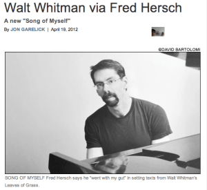 “For myself, I hear a kind of classical post-War Americana in Hersch’s piece, maybe as much Copland and Bernstein as Ellington. But what impresses throughout is the balance of text and music.” Read more: http://thephoenix.com/boston/music/137476-walt-whitman-via-fred-hersch/#ixzz1sbhrXqVz